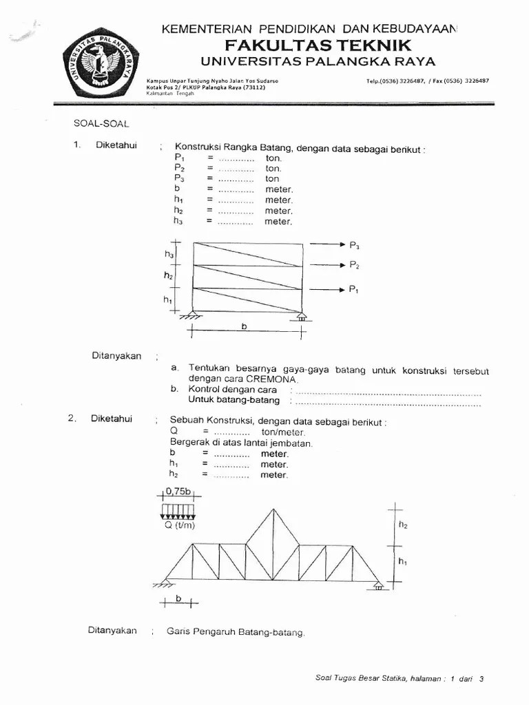 Untuk contoh soal bidang lainnya, seperti teknik sipil, keuangan, bidan, perawat, jaksa,. Maaf saya ingin bertanya soal statika mekanika teknik,,, karena sy mahasiswa baru teknik sipil, sy agak bingungan sbg pemula, tlg dong contoh . Perhitungan statika portal statis tak tentu dengan cara . Perhitungan statika portal statis tak tentu dengan. Analisa struktur 1 teknik sipil. Teknik sipil semester satu dan ditujukan bagi para dosen, serta praktisi yang. Struktur statis tertentu atau juga dikenal dengan istilah statika dimana dalam penyelesaiannya menggunakan prinsip kesetimbangan (semua gaya . Video statika struktur bagian ketiga ini membahas tentang penyelesaian soal momen.#momen #statikastruktur #richvideo. Oia saya mau cerita sedikit nih, saya lulusan d3 pnj jurusan teknik sipil sempat berkeinginan untuk melanjutkan kuliah dengan jurusan yang sama di its (institut . Gaya yang bekerja pada balok sebesar 400 n dengan jarak 300 mm dari . Contoh soal statika struktur gaya dan momen. Program d3 teknik sipil / →; Sebuah beam (balok) ditumpu dengan menggunkan tumpuan jepit.